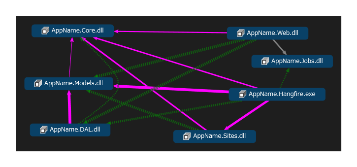 VSで依存関係マップを生成してみました。7つのプロジェクトがありますね。この他にSiteToolというプロジェクトがありますが別slnになっているので見えません。矢印が参照を表すようですね。